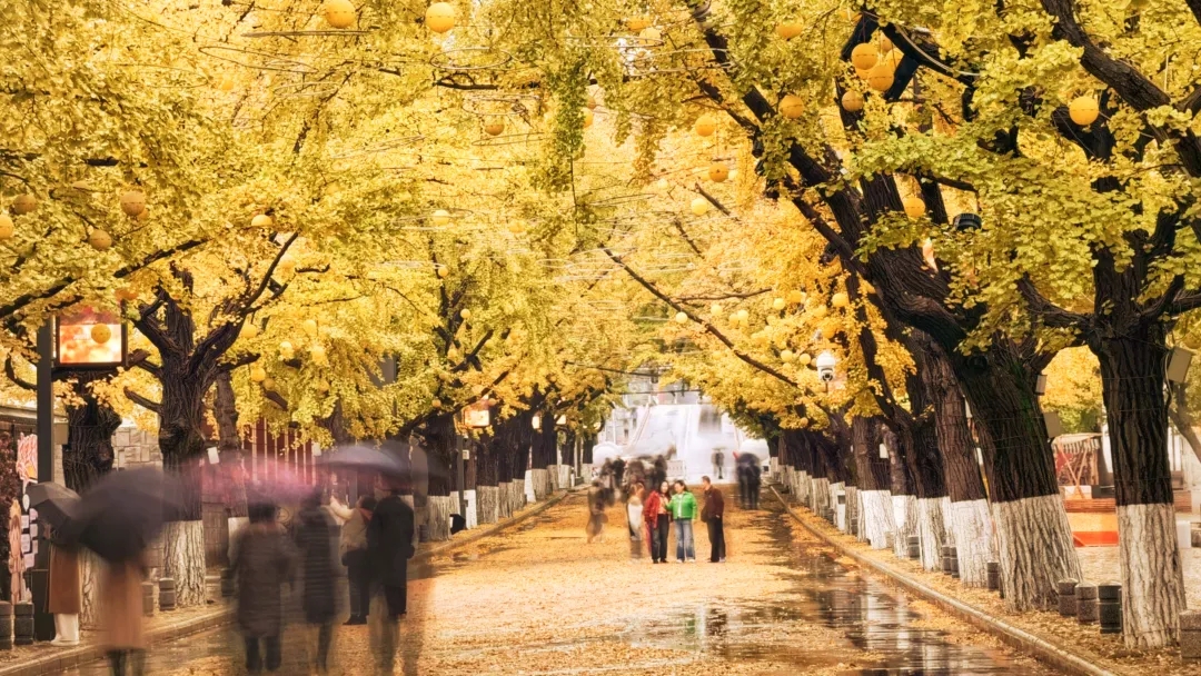 ??被秋雨润泽后展现动人姿态的百年银杏大道,正以洗尽铅华后的澄澈与宁静,等待着与你相遇。