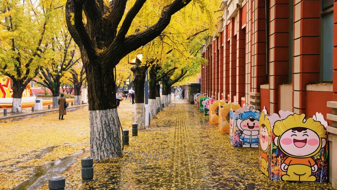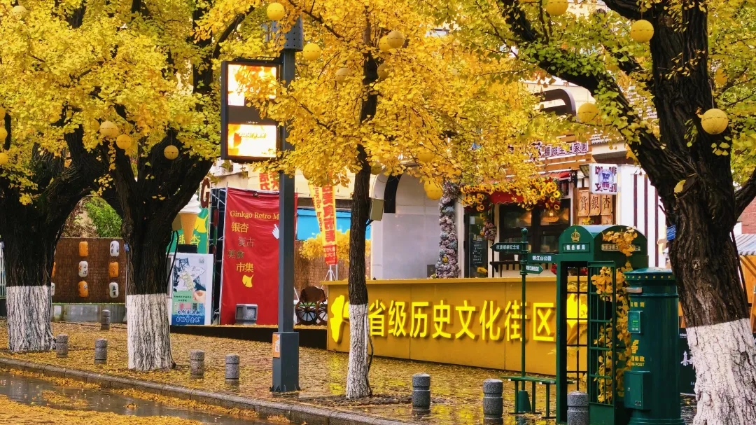 ??历经百年风雨的银杏树,虬枝交错,黄叶如蝶,织就了一片璀璨的金色穹顶。被雨水洗涤过的叶片,色泽愈发鲜亮润泽,与湿润的街面石板相映成趣。